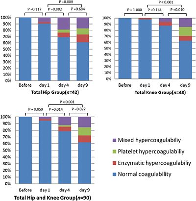 Yang 等人使用血栓弹力图监测选择性关节置换术患者血栓预防后的血凝变化,发现全髋关节和全膝关节组在第 1~4 天和第 4~9 天不同高凝状态的分布均有明显变化。术后第 9 天,90 例(37.8%)全髋关节和全膝关节患者中有 34 例(37.8%)出现高凝状态(图 2)。